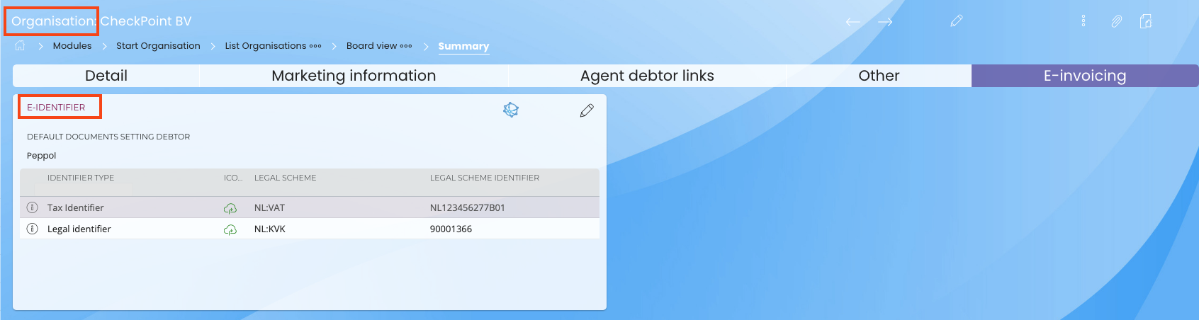 Now you can configure whether invoices should be sent via Peppol per organization / debtor. In the example below, we configure this for the debtor. Based on the identifier type you enter here (Chamber of Commerce or VAT of the customer), the customer can be found on the Peppol network.