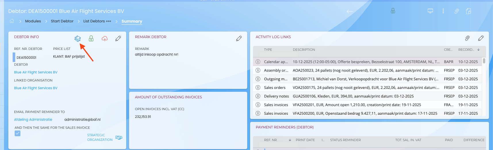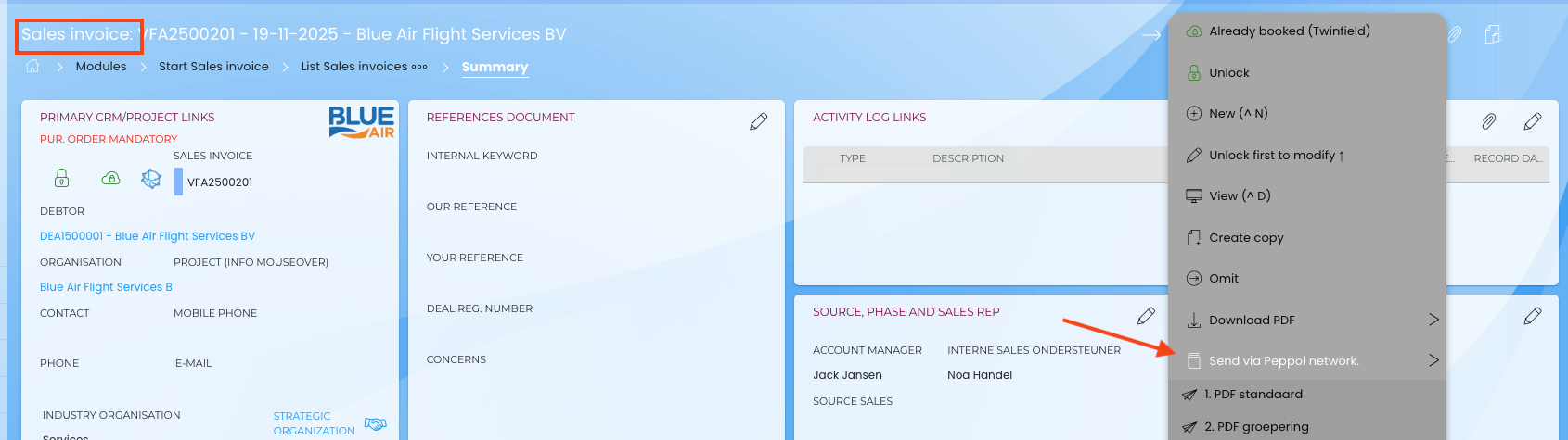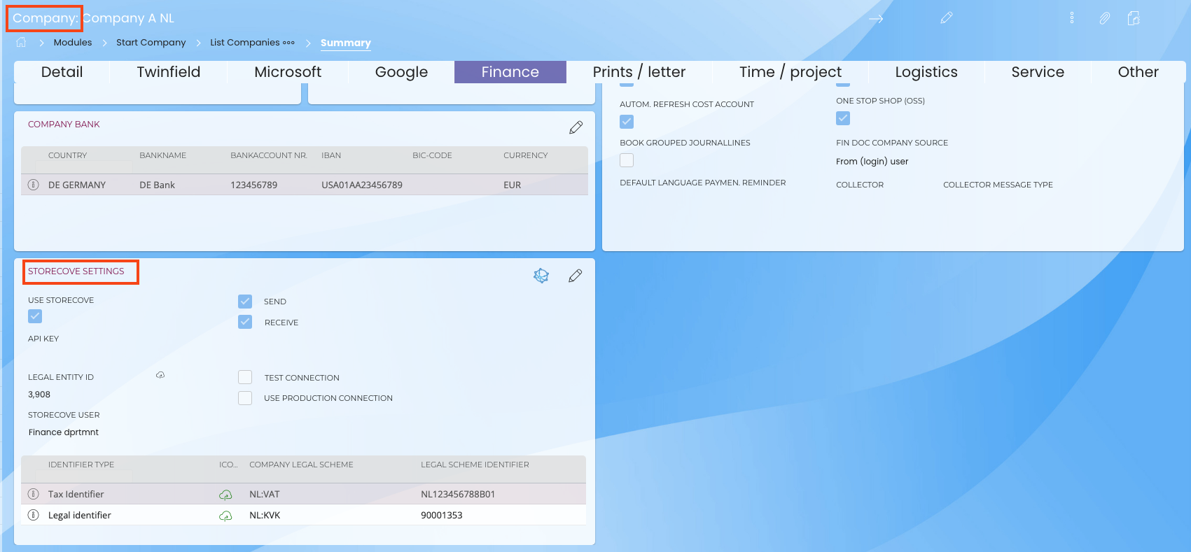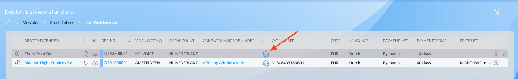 For debtors, there's a field where you can enter the VAT number. This number is sent to Twinfield and printed on the invoice. For Peppol, you must enter the VAT number as an e-identifier, as described below.