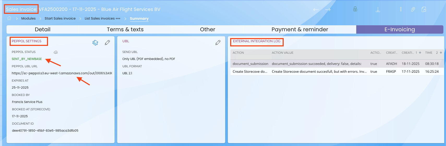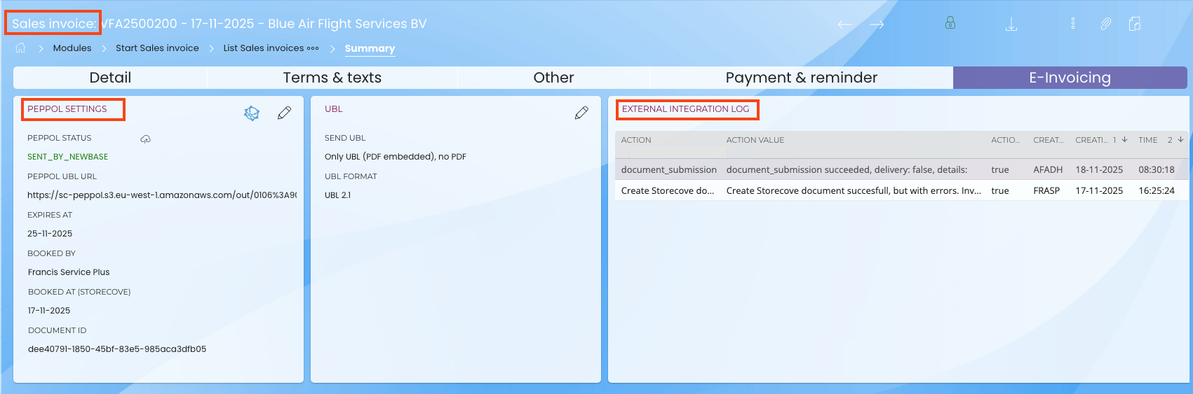 When you create an invoice for a debtor set up with Peppol, the invoice automatically receives the Peppol settings. Within the sales invoice module, you have the widgets "Peppol settings" (WID04612) and "External integration log" (WID02099), where you can view the invoice status.