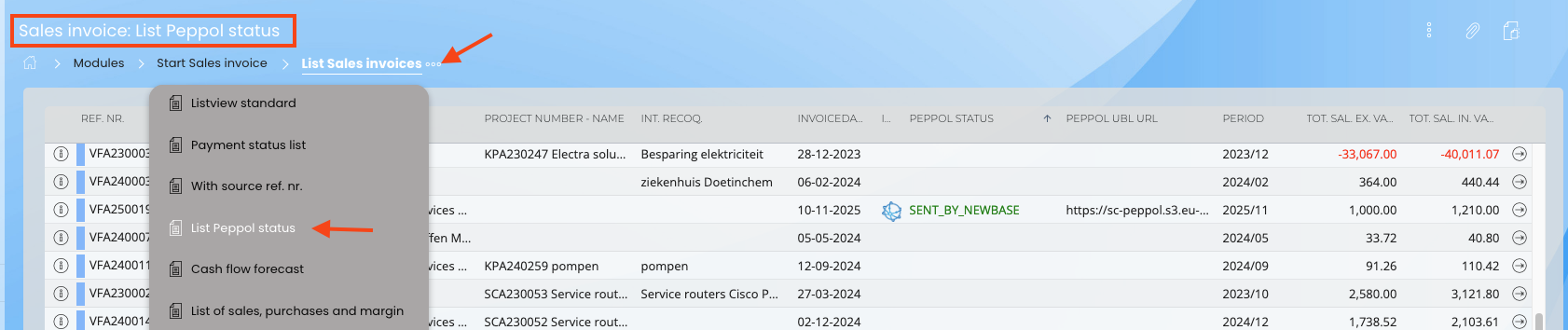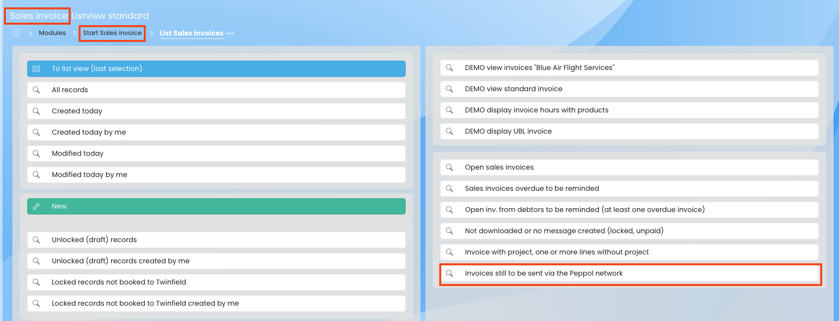 On the home screen of the sales invoice module, you can perform a standard query. This search is called: Invoices yet to be sent via Peppol network.