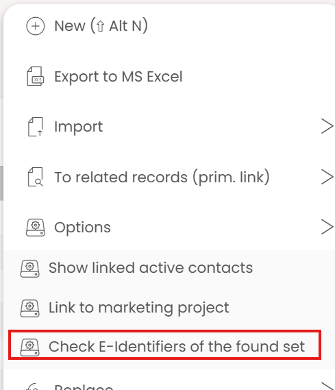 There is also a possibility to check the found set of creditors, debtors or organisations for existing e-identifiers, by adding an option.