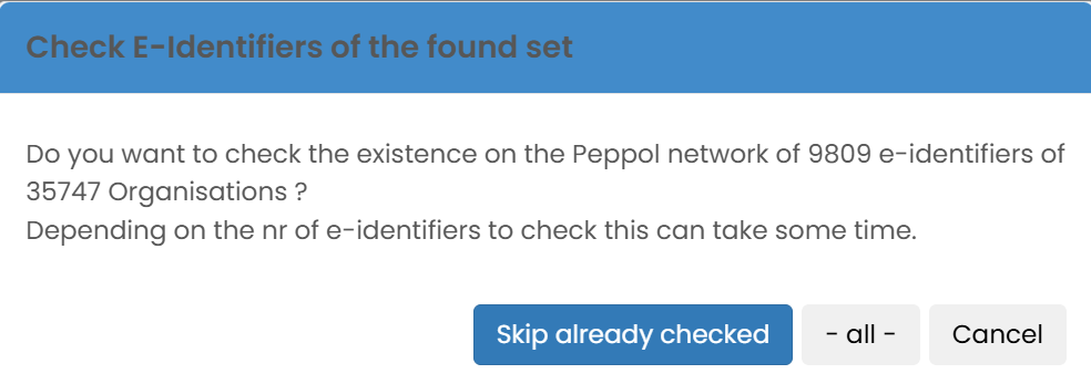 You have the choice to verify e-identifiers of the found set, or only the ones that could not be found before, or are not verified. In general, once an e-identifier is known on the Peppol network, it will probably stay there for a long time, but new companies might have registered themselves with one of the e-identifiers already entered in the Newbase application.