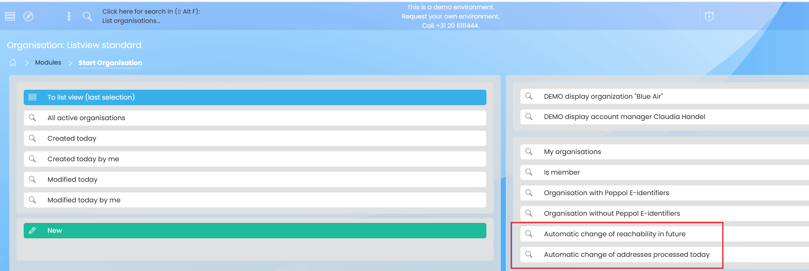 There are a number of default searches available for modules that have the option to enter address or reachability changes in the future. The internal Newbase application manager can set these default searches for roles that would like to have these available, for example: