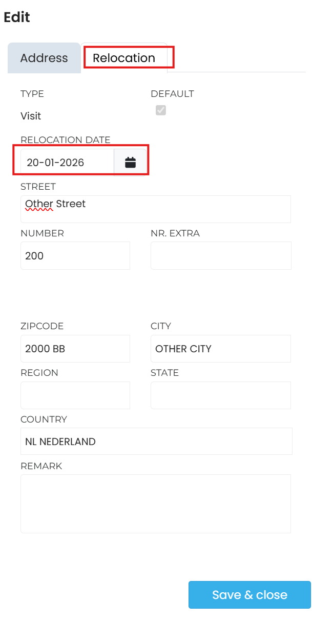 It is possible to enter relocation (address / reachability changes) to be activated on a future date.