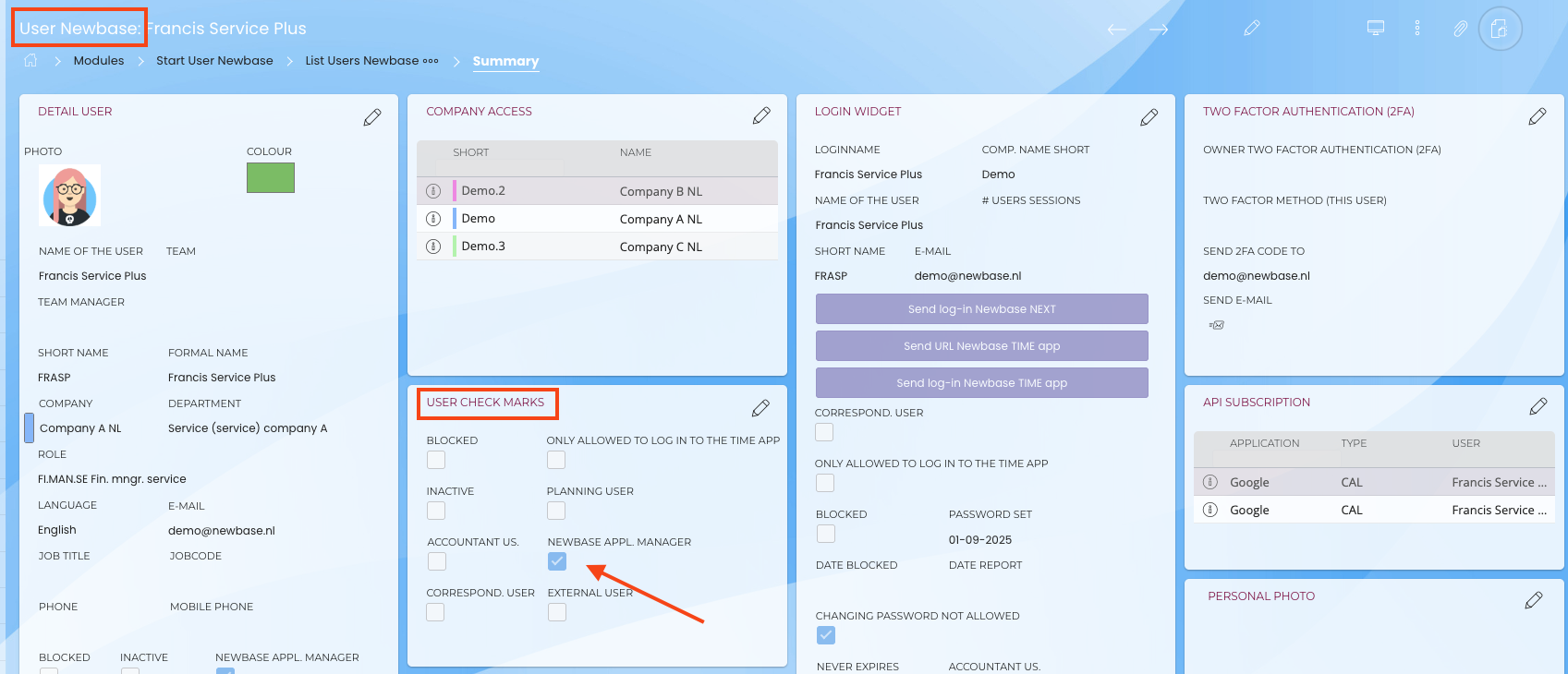 - The internal Newbase application manager must be designated as such in Newbase. You can do this by checking the "Newbase appl. manager" box within the "user checkboxes" widget on the user card. If you don't have this widge you can add it.