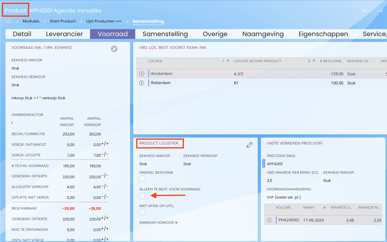 Dit doe je door het vinkje aan te zetten binnen de widget 'product logistiek' binnen de module product.