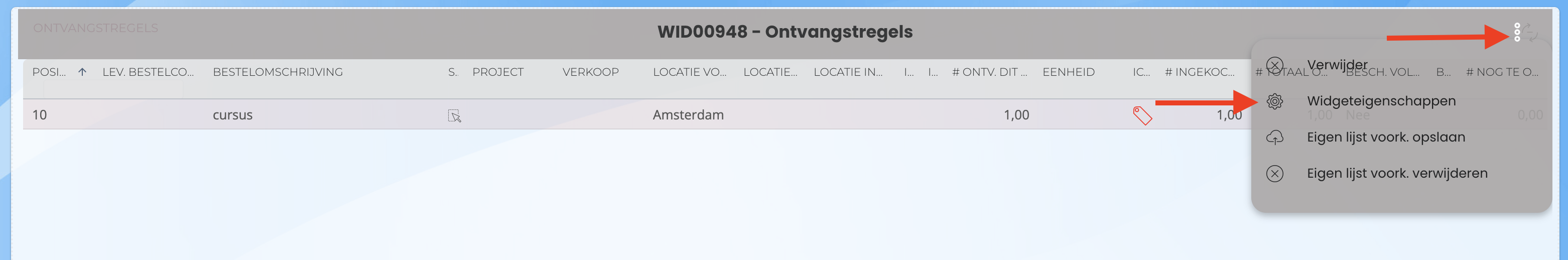 Stel dat je de eigenschappen van een widget wilt wijzigen. In dit voorbeeld de eigenschappen van de widget ontvangstregels van de module ontvangst.