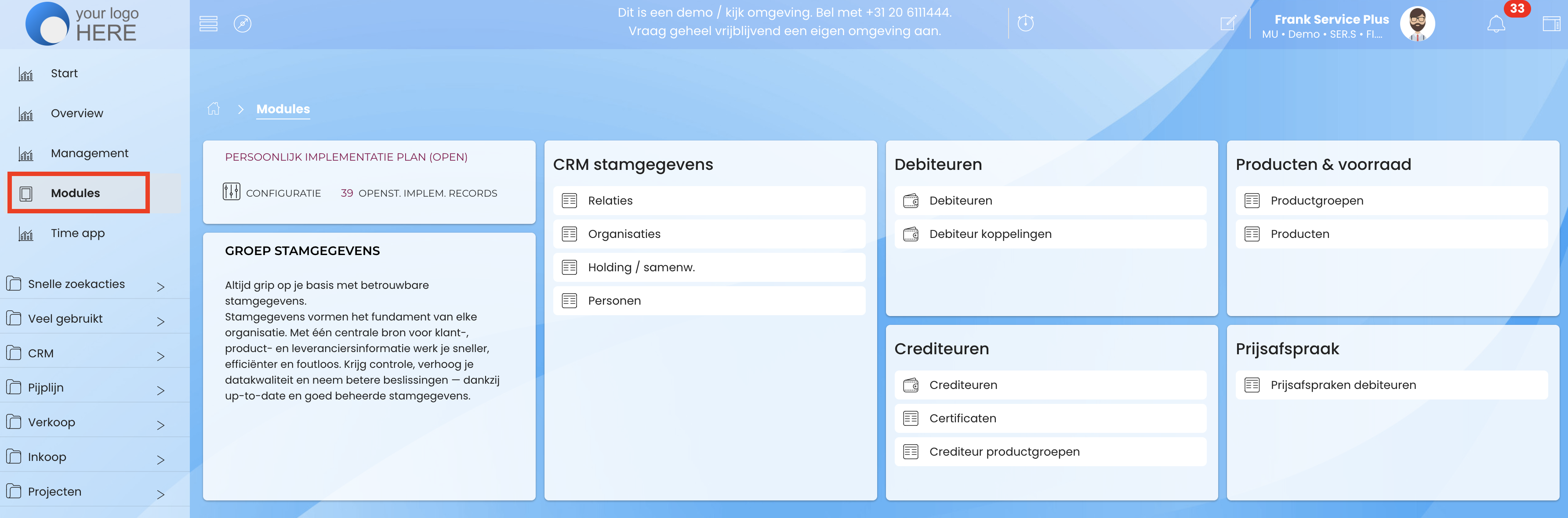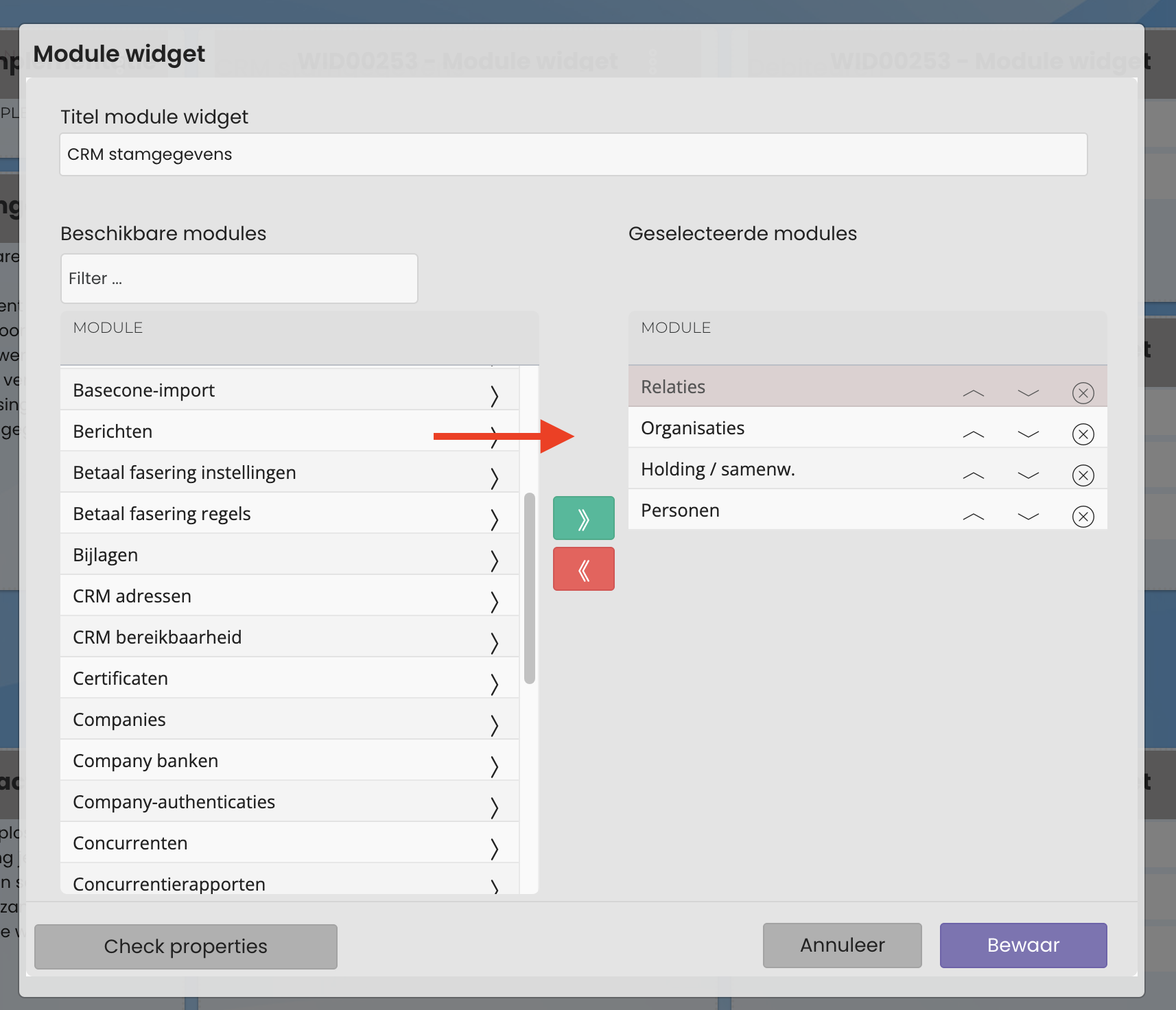 - Nu opent een pop-up waar je modules van links naar rechts kunt klikken. Zoek de module dit je wilt toevoegen en hevel deze over naar rechts. Klik vervolgens op bewaar en vervolgens op klaar.