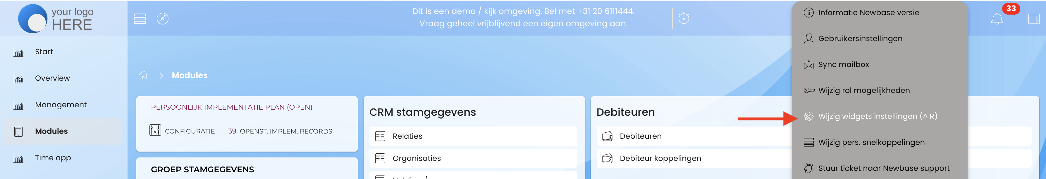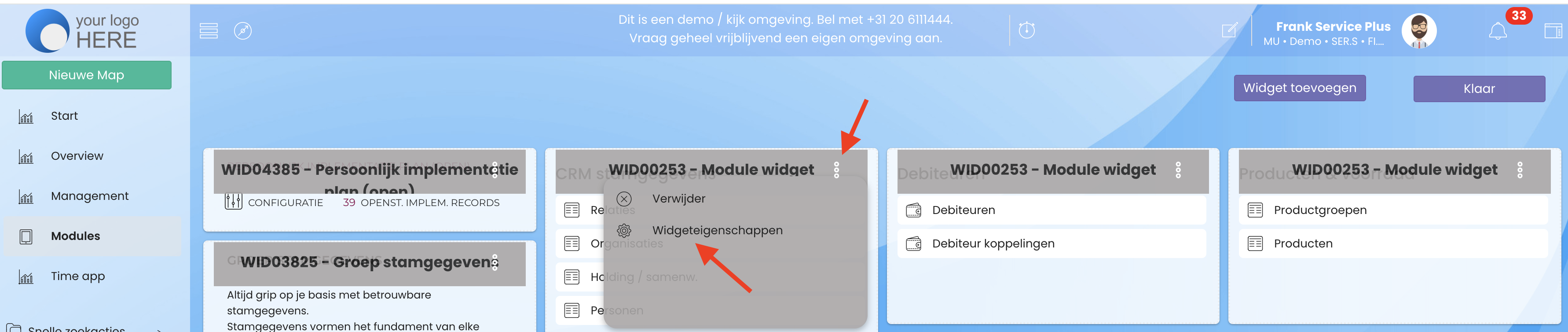 - Klik op de 3 puntjes binnen de module widget waarbinnen je een module wilt toevoegen en kies voor Widgeteigenschappen