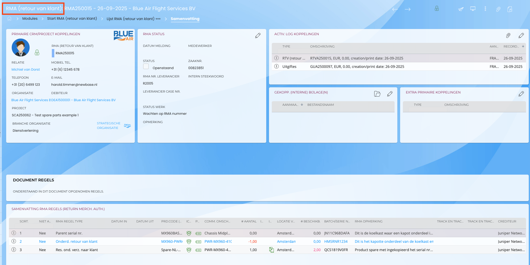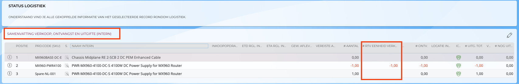 In het widget RMA “Samenvatting verkoop, ontvangst en uitgifte (intern)” zie je nu het gekoppelde aantal van de RTV staan. Zie onderstaand voorbeeld.