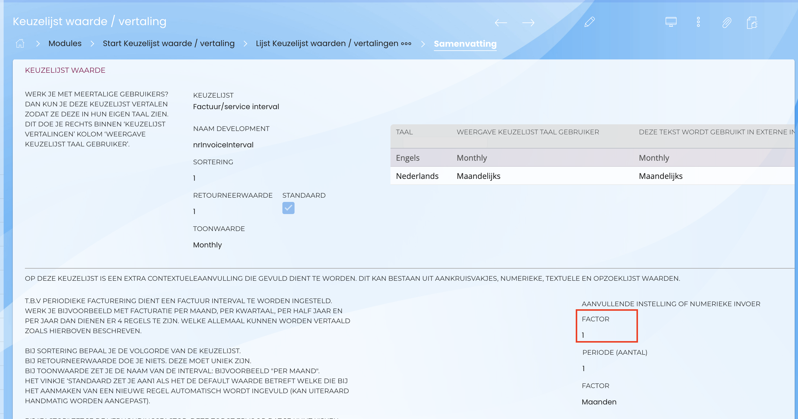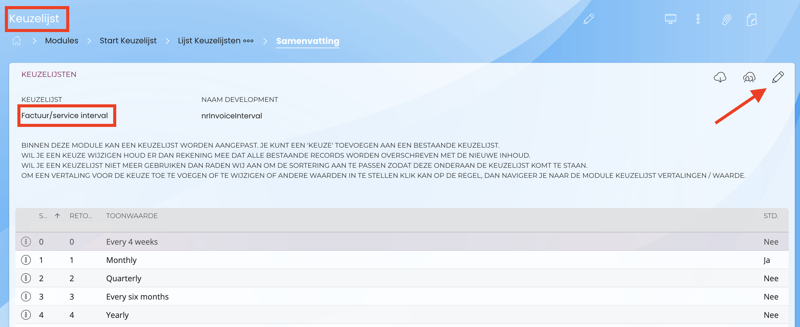 - Voor het instellen van deze keuzelijst met verschillende interval mogelijkheden ga je naar de module keuzelijsten en zoek je de keuzelijst 'factuur/service interval'