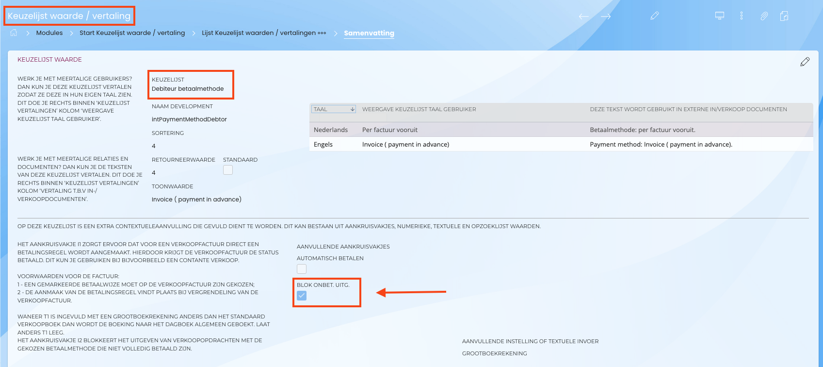 Dit kan (door de interne applicatiebeheerder) worden ingesteld binnen de keuzelijst 'debiteur betaalmethode'. Hier heb je de mogelijkheid om een vinkje "blokeer onbetaalde uitgifte aan te zetten". Voor meer informatie over keuzelijsten klik hier.