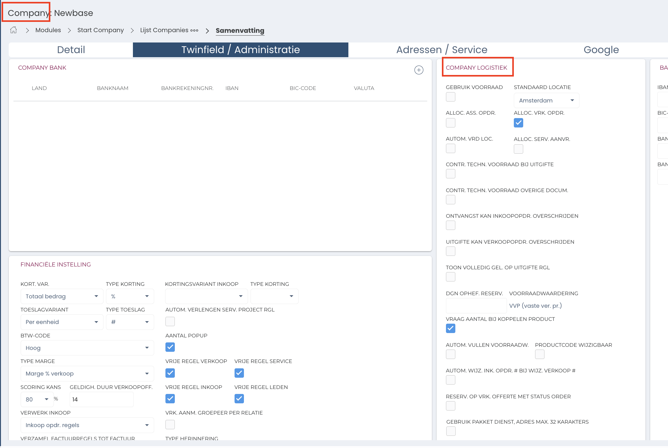 Binnen de widget Company logistiek (Module Company) kunnen diverse zaken worden ingesteld m.b.t. voorraad en logistiek.