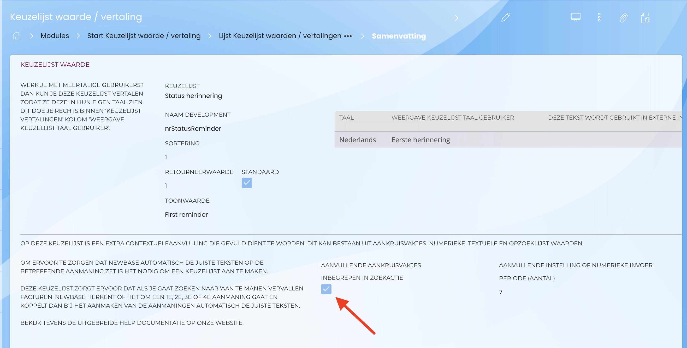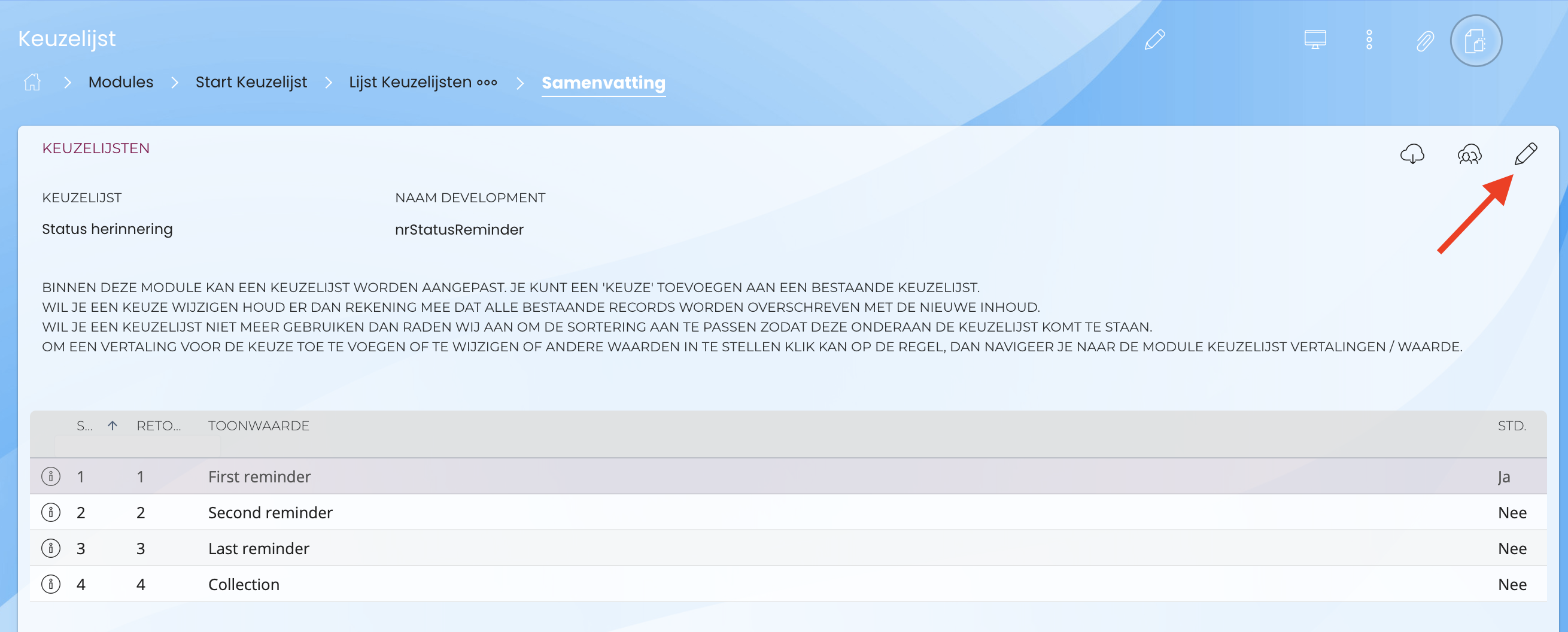 - Zoek in veld keuzelijst naar ‘status herinnering’