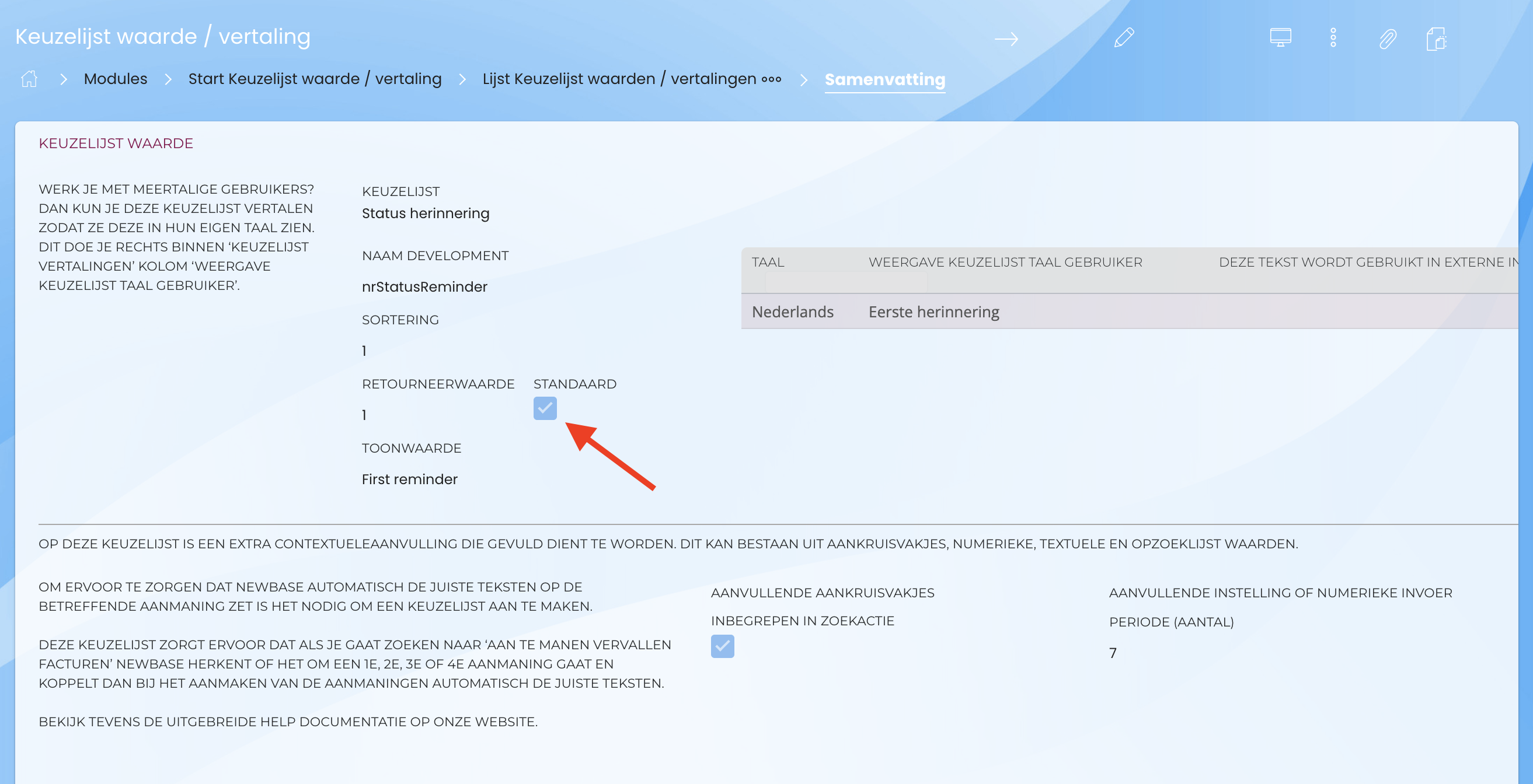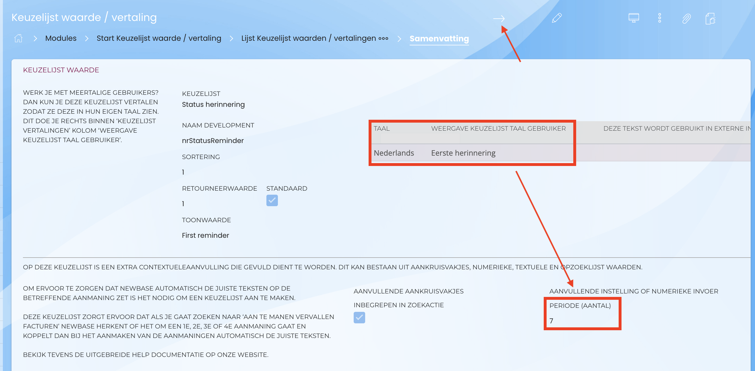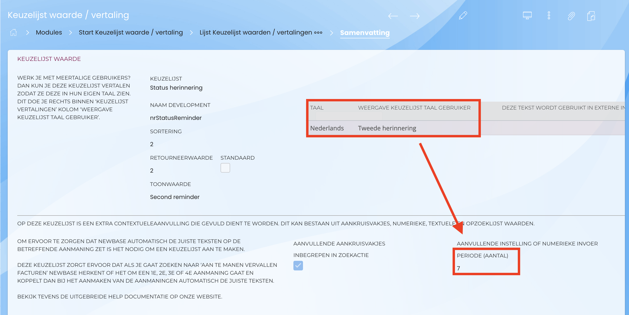 Om ervoor te zorgen dat Newbase weet welke teksten op de aanmaning moeten komen is het nodig om een keuzelijst aan te maken die ervoor zorgt dat als je gaat zoeken naar ‘aan te manen vervallen facturen’ Newbase herkent of het om een 1e, 2e, 3e of 4e aanmaning gaat en koppelt dan bij het aanmaken van de aanmaningen automatisch de juiste teksten. Dit doet Newbase op basis van het aantal dagen dat je instelt.