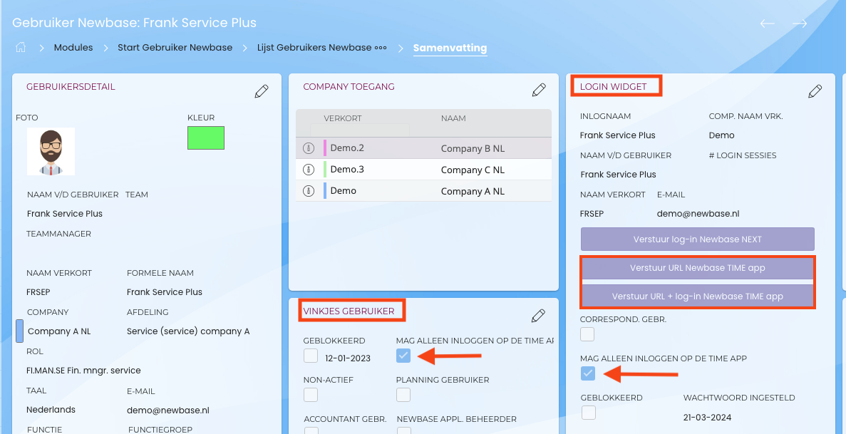 Je kunt vanuit de gebruikerskaart in Newbase de URL en de inloggegevens voor de tijdschrijf app aan de gebruiker mailen.