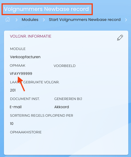 Volgnummers kunnen per jaar verschillen en dienen wellicht bij een jaarovergang te worden aangepast. Dit kun je doen binnen de module Volgnummers Newbase records.