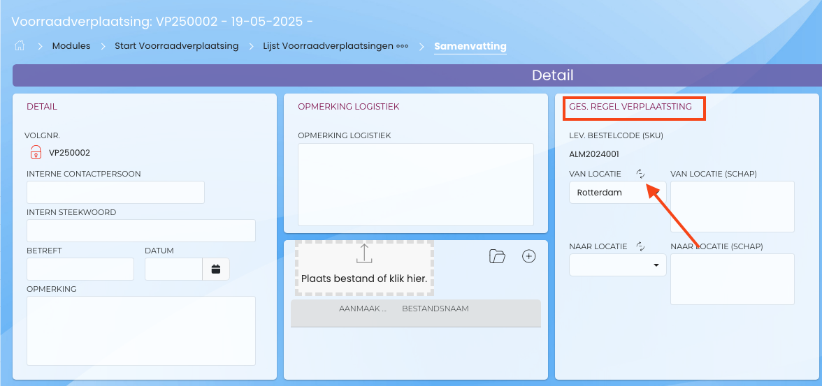 - Vervolgens kun je in de regel het aantal dit je wilt verplaatsen invullen en van welke locatie naar welke locatie de voorraad verplaatst moet worden.