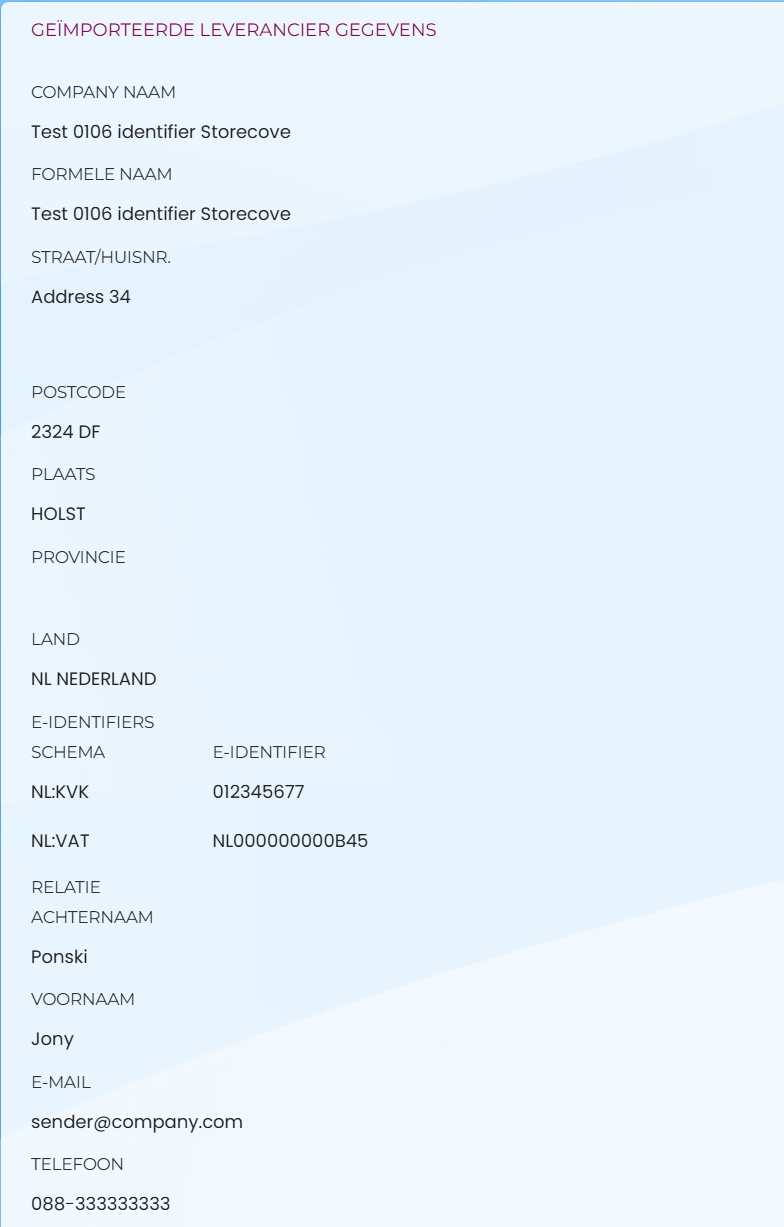 De leverancier onfo van de geimporteerde inkoopfactuur. Vooral handig in de situatie dat een inkoopfactuur ontvangen wordt van een crediteur waarvan de e-identifiers (bijv BTW nummer) in Newbase niet gevonden is.