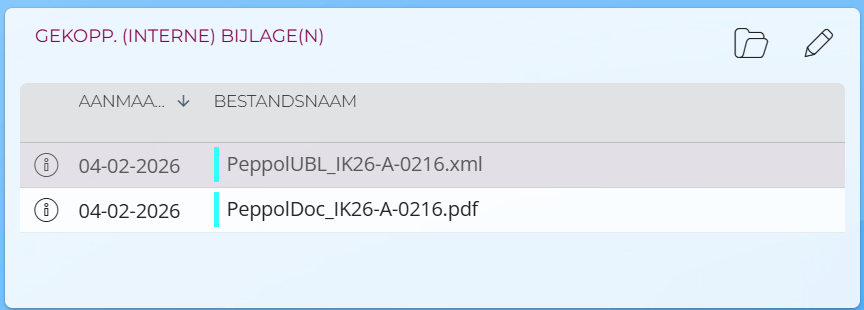 Indien op company niveau de Storecove gebruiker en cloud pad voor inkoopfactuur correct zijn ingesteld, zijn hier de meegeleverde bijlagen zichtbaar: