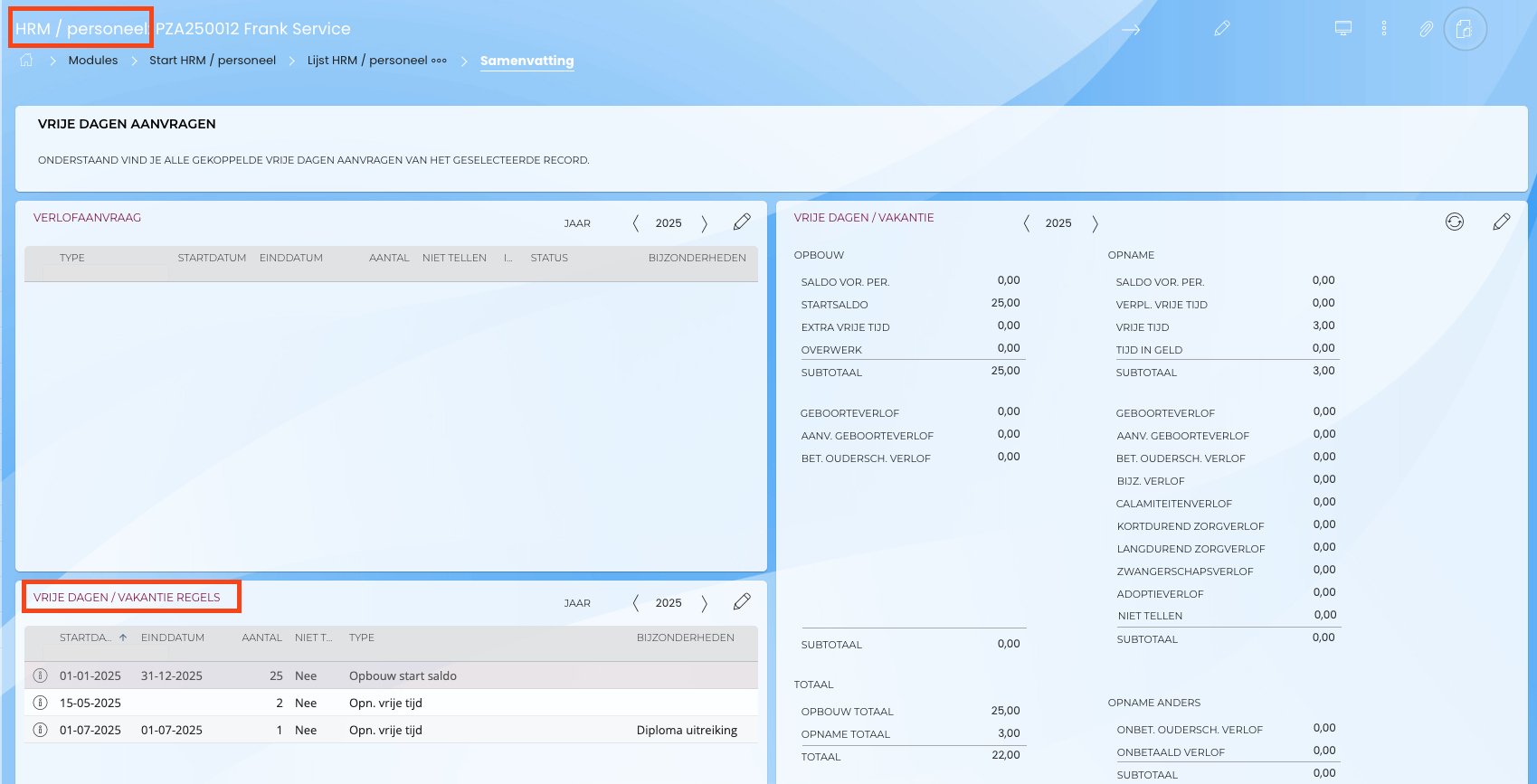 - Ga naar de module HRM / Personeel en selecteer de betreffende medewerker