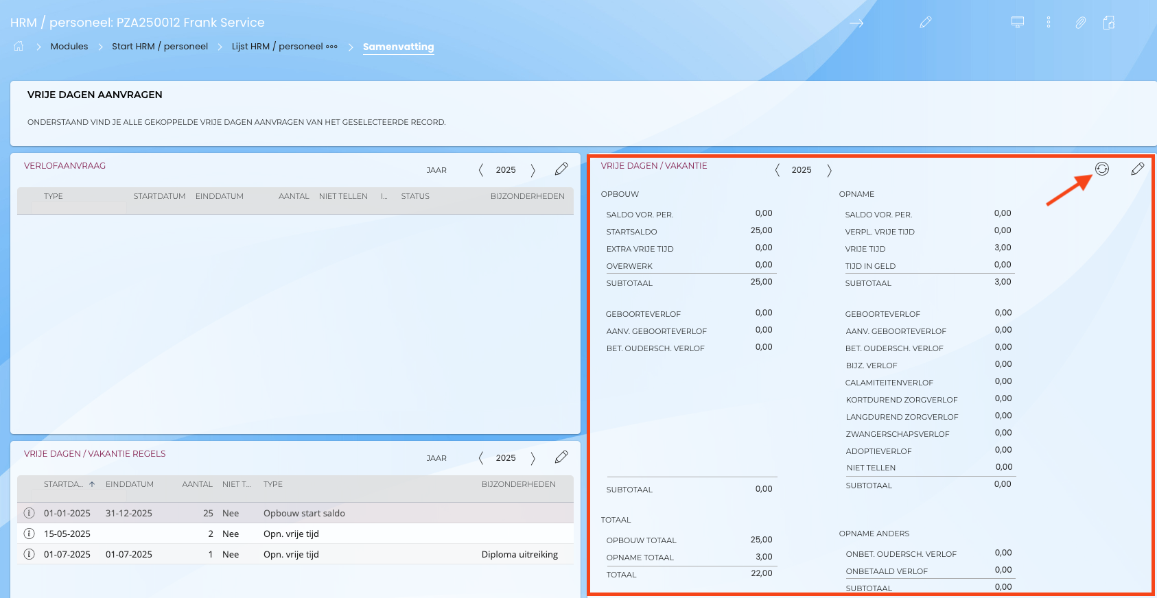 Het totaal van alle opgebouwde en opgenomen dagen kun je zien in de widget 'Vrije dagen / Vakantie. Als je nieuwe regels hebt aangemaakt dien je dit widget te verversen via het icoon (zie pijl).