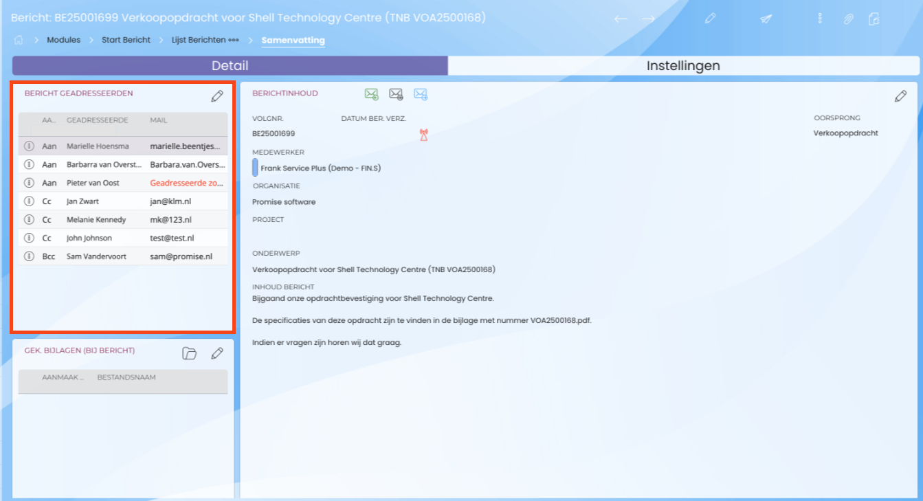 Is het bericht aangemaakt vanuit een document, bijvoorbeeld een factuur, dan zal hoogst waarschijnlijk al een geadresseerde zijn gekoppeld, een bestand als pdf zijn gekoppeld, een standaard tekst vanuit een sjabloon zijn ingevuld.
