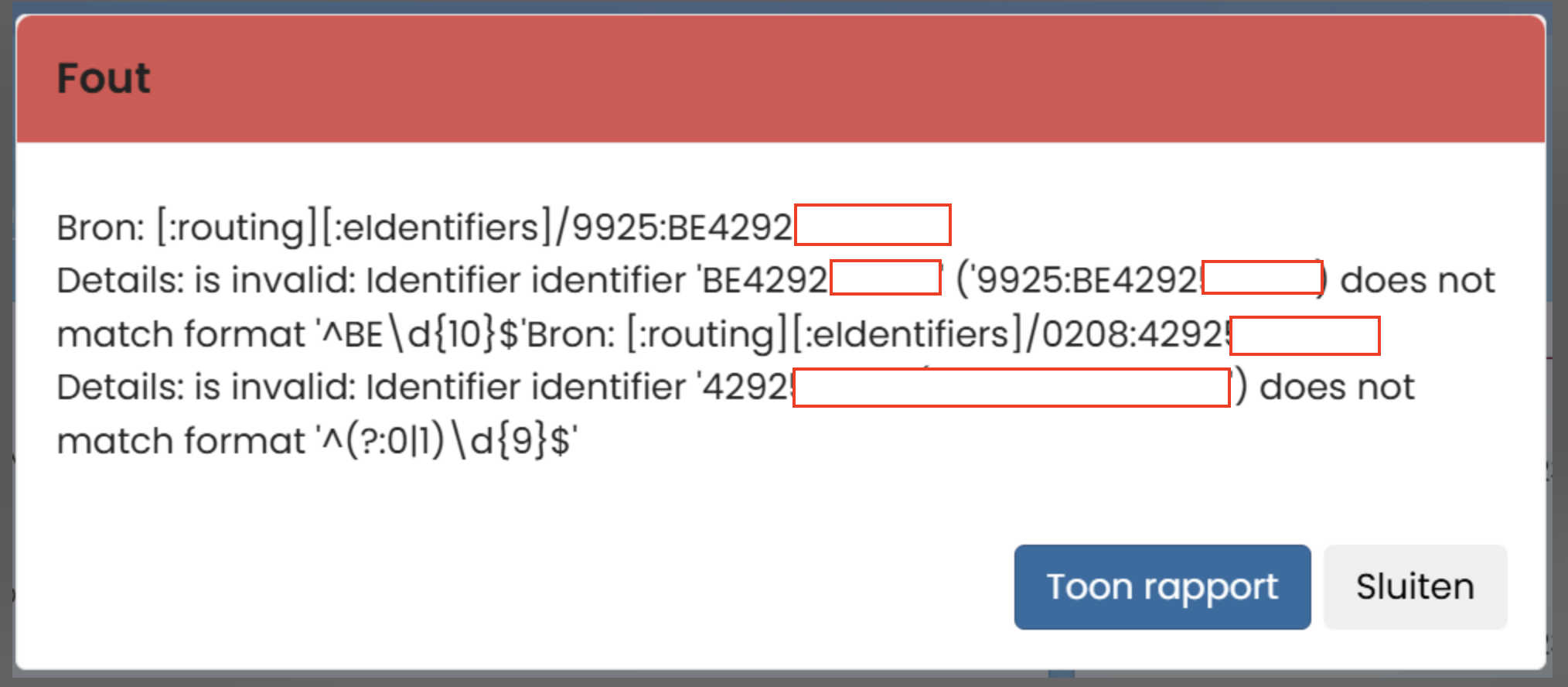 In dit onderstaand voorbeeld wordt melding gegeven van fouten in twee e-identifiers van een Belgische debiteur.