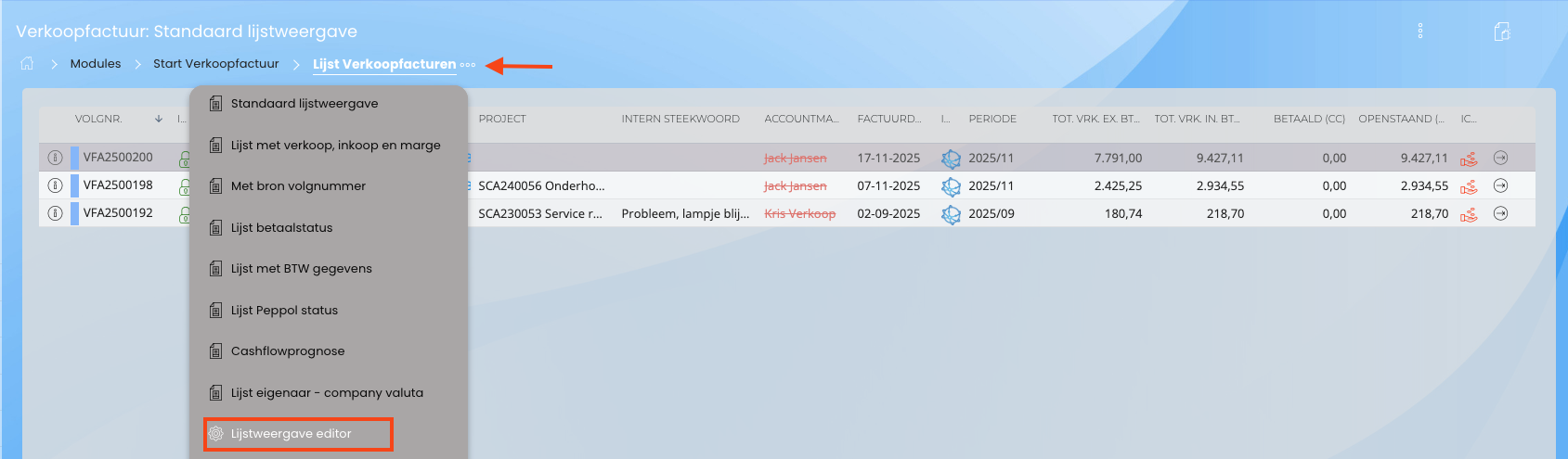 - Een menu opent waar je alle beschikbare lijsten ziet en kunt kiezen voor lijstweergave editor