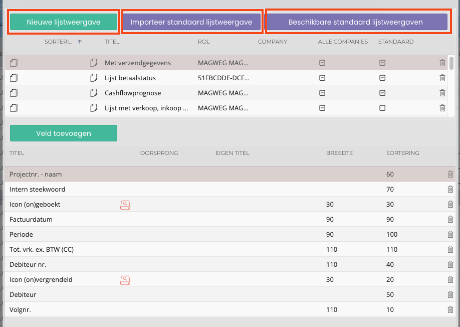 - Je kunt nu OF alle velden handmatig stuk voor stuk toevoegen via de groen knop 'veld toevoegen' OF je klikt eerst op de paarse knop 'importeer standaard lijstweergave' Op dit manier worden alle velden van de standaardlijstweergave overgenomen en kun je deze aanpassen, wellicht is dat minder werk dan alles veld voor veld toevoegen