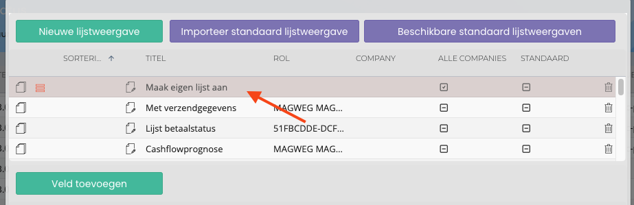 - Selecteer een bestaande lijst om deze te kunnen aanpassen door velden toe te voegen via de knop veld toevoegen of door bestaande velden te verwijderen door achter de regel op het prullenbakje te klikken.
