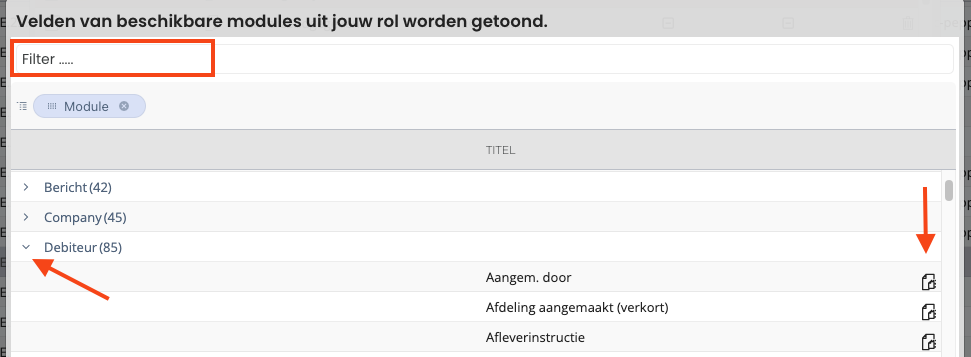 - Als je klikt op 'Veld toevoegen' opent een pop-up met een lijst van modules waarvan je velden kunt toevoegen aan je lijst. Klik een module open, zoek het veld dat je wilt toevoegen en klik op het icoon rechts. Herhaal deze actie tot alle gewenste velden in de lijst staan. Je kunt ook zoeken naar velden bij 'filter' Je kunt eventueel nog de sortering van de kolommen aanpassen.